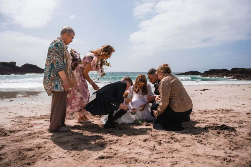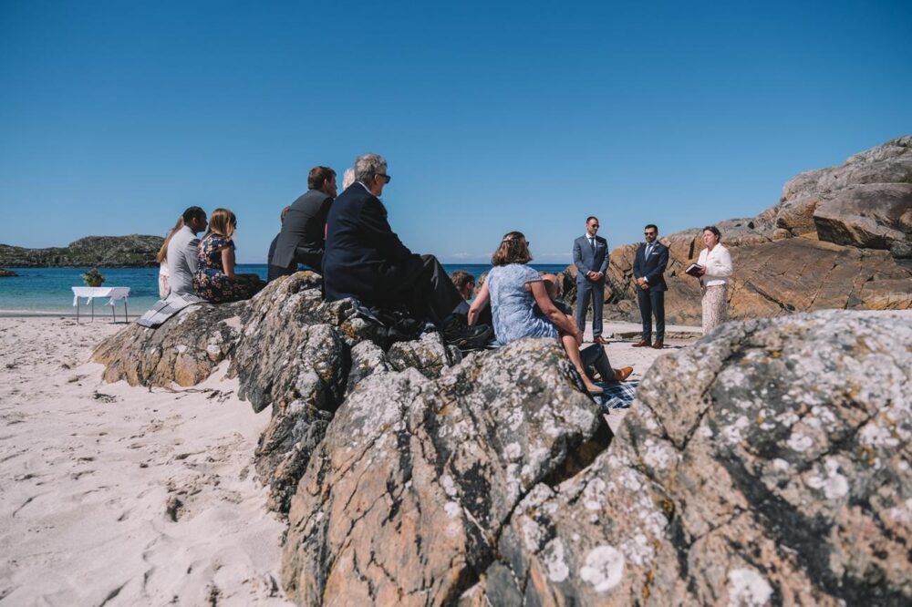On the day sunshine, warmth and a perfect light breeze welcomed the wedding party at the car park, where I met Chris & Rico, the wedding guests and Allan the photographer. A somewhat different wedding processional followed, along the track and then down the path, laden with blankets, flowers, buckets and spades, pies, cake and champagne – and all sensibly wearing wellington boots. As we set up everybody was astonished about the weather, and incredibly awed by the atmospheric setting – the sparkling white coral sand, shades of turquoise water and blue sky. For the ceremony Chris & Rico had chosen a part of the beach which comes with a backdrop of 3 billion year old rocks of Lewissian Gneiss. The features of the sand and rocks and the stream flowing towards the sea change all the time and luckily, at this very moment, the exposed rocks formed the perfect seating area for the wedding guests, looking towards the couple, and the sea in the background.