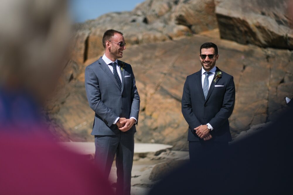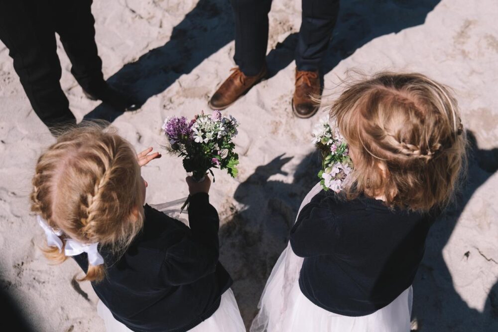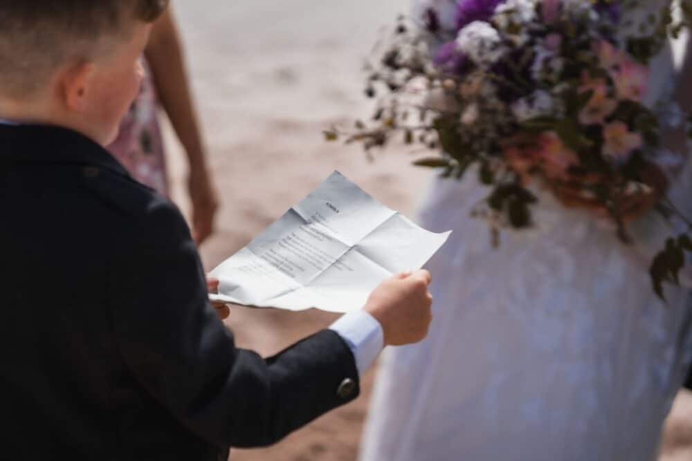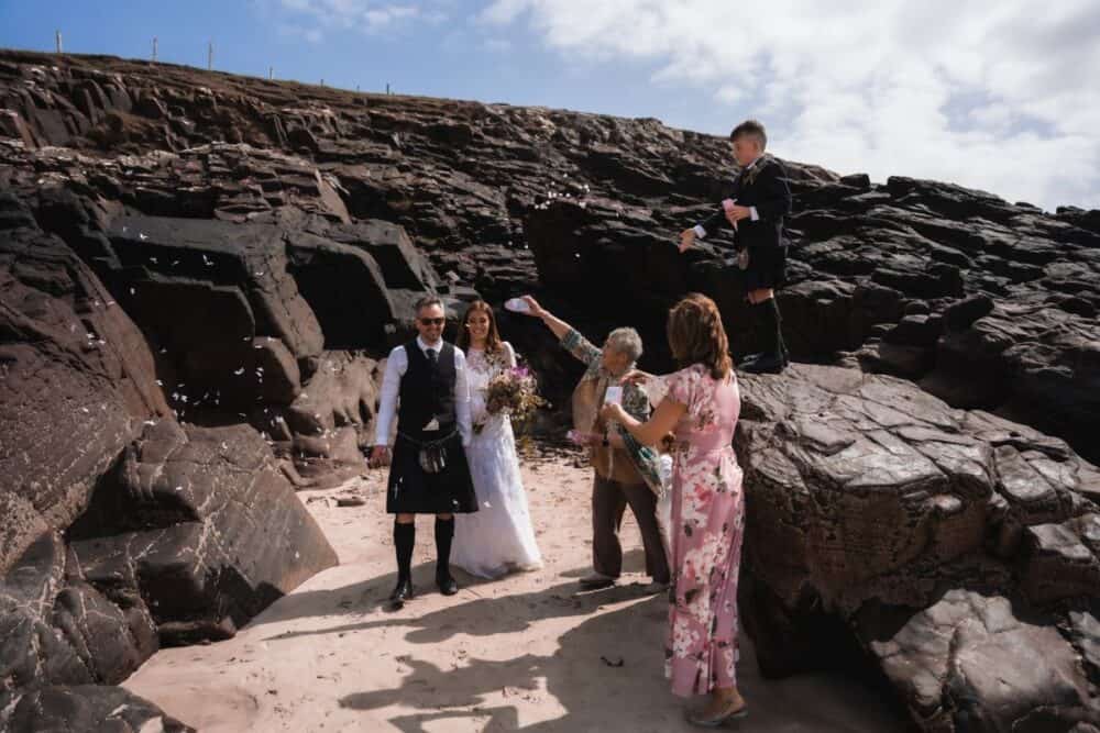 With everybody settled in our ceremony spot, with a backdrop of blue sea and white sand, what better way to start than with a poem about dogs on a beach, establishing the tone of the ceremony as fun and relaxed. What followed were heartfelt promises to each other, a sand ceremony that delighted the youngest member of the wedding party in particular, a lovely poem about family read by the couple’s son, rings, and a lovely impromptu contribution by Patrick’s mum. With the dogs happily frolicking in the background we signed the marriage schedule in a sheltered corner of the beach, propped up against ancient rocks and then celebrated with flower confetti.