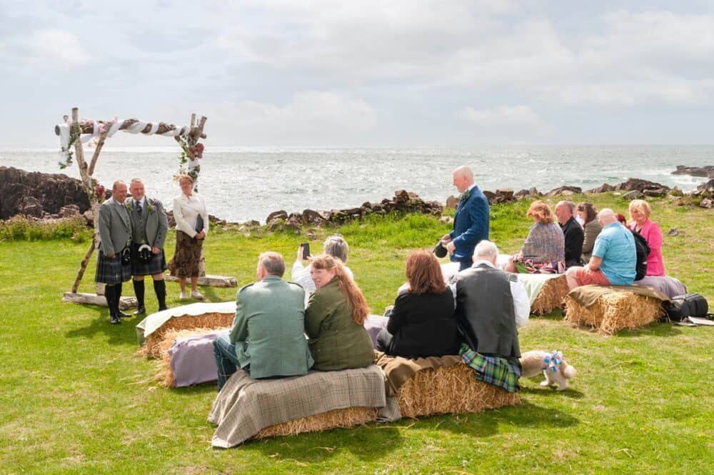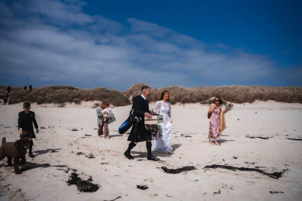 It was a smaller event than originally planned, but truly special! The sun had made the perfect appearance in early afternoon, just in time for  the wedding processional  to head down the white sandy beach, accompanied by piper Gilly Bee. The groom and wedding party were waiting at the beautiful wooden arch Rhona’s dad had built, and what followed was a ceremony that was caring, fun and relaxed, just like the couple at the centre of it. It included readings by both the bride’s and groom’s mother, Rhona and Calum’s love story and vows to each other, rings and a handfasting and quaich . There were lots of  smiles, some laughter (especially at Benji the dog digging under the chairs and then barking at the piper), and a few tears.  You can see that perfect little personal space created for family & friends, which felt really special and intimate, and yet there were quite a few people around the beach and up the hill who all felt so privileged to witness such a happy occasion from a distance.